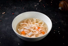 Густой бульон из курицы. Лапша из пшеницы нежная. Морковь сладкая, миниатюрная, добавляет сладость и яркость