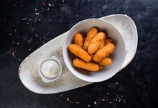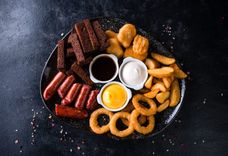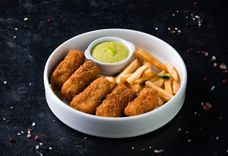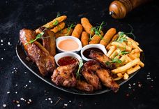 700 г • Куриные наггетсы, луковые кольца, картофельные дольки, охотничьи колбаски, гренки из бородинского хлеба с чесноком, соусы: грибной, сырный, темпур.