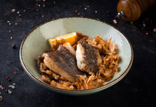 300 г • Дорадо гриль с гарниром из грибов, сладкого перца, красного лука с соусом устрично-тамариндового
