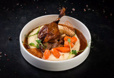 310 г • Утиная ножка, нежная и ароматная. Подаётся с воздушным картофельным пюре. Морковь добавляет сладость и хруст. Соус подчёркивают вкус утиной ножки