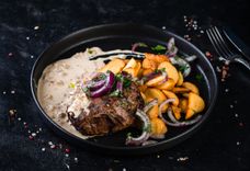 350 г • Нежнейший стейк из свиной шеи, приготовленный методом sous vide в фирменном маринаде, далее обжаренный на гриле с грибным соусом с картофельными дольками.