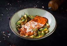 310 г • Филе лосося нежное, слегка сладковатое. Подаётся слайсами цукини-пропитанными манго соусом. Соус на основе шампанского и красной икры идеально завершает блюдо