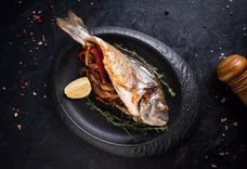Дорадо гриль с вешенками и овощами в устричном соусе