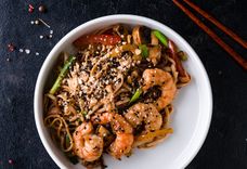С креветкой в соусе манго-мерияки и пшеничной лапшой